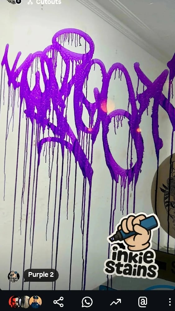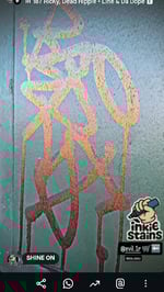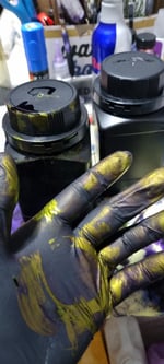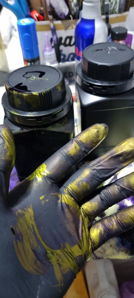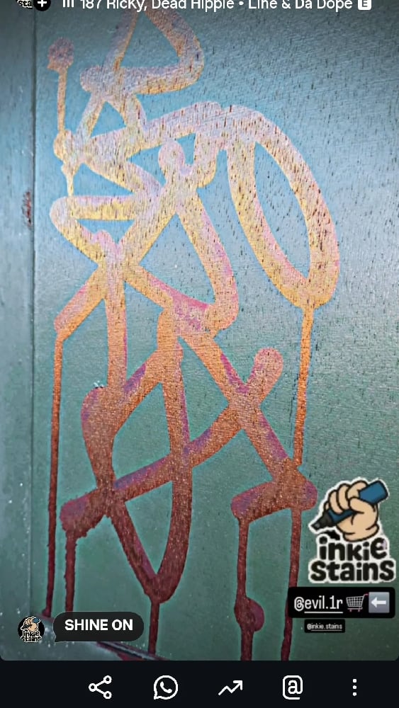 Glows gold shimmer is purple in other aspects of light, minimal solvent stink so u dont turn heads when doin sneaky tags, dries a little slow,